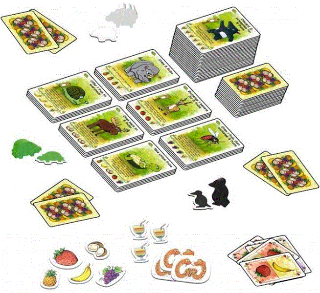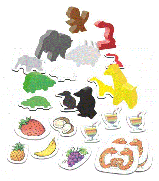 • Inhalt: 240 Ortskarten, 70 Fruchtkarten, 6 Holztiere und Plättchen, 1 Dieb, 12 weitre Plättchen, 1 Anleitung, 1 Glossar