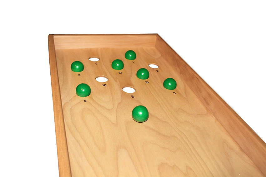 Die einzelnen Löcher am anderen Ende des Spielfelds sind mit unterschiedliche Punktzahlen markiert. Die Kugeln werden natürlich so gespielt, dass sie in die Vertiefungen mit möglichst hohen Werten fallen. Kugeln, die das Ziel verfehlt haben und zurückgerollt sind, dürfen nicht nioch einmal genutzt werden. Die Punkte der Vertiefungen, in denen eine Kugel liegen