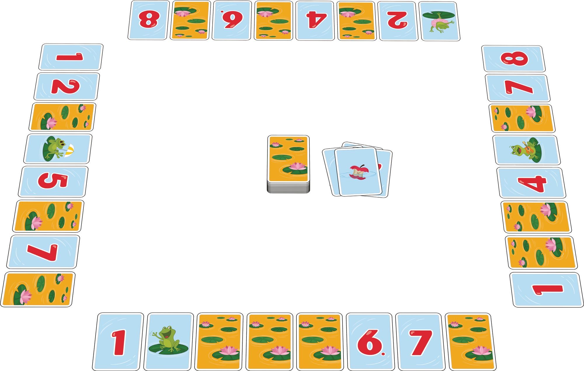 Das Kindergesellschafts-Spiel Fröschis von Amigo ist ein munteres Froschteich-Spiel: Zahlenkarten müssen geordnet werden, aber im Froschteich ist leider auch Müll drin! Ideal für Kinder mit einfachen Regeln.