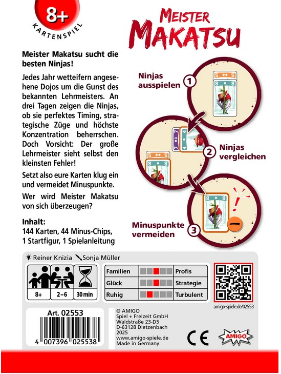 Meister Makatsu ist ein schnell erlerntes Kartenspiel von Amigo und Erfolgsautor Reiner Knizia mit lustig-originellen Illustrationen. Setzt eure Karten klug ein und vermeidet Minuspunkte.
