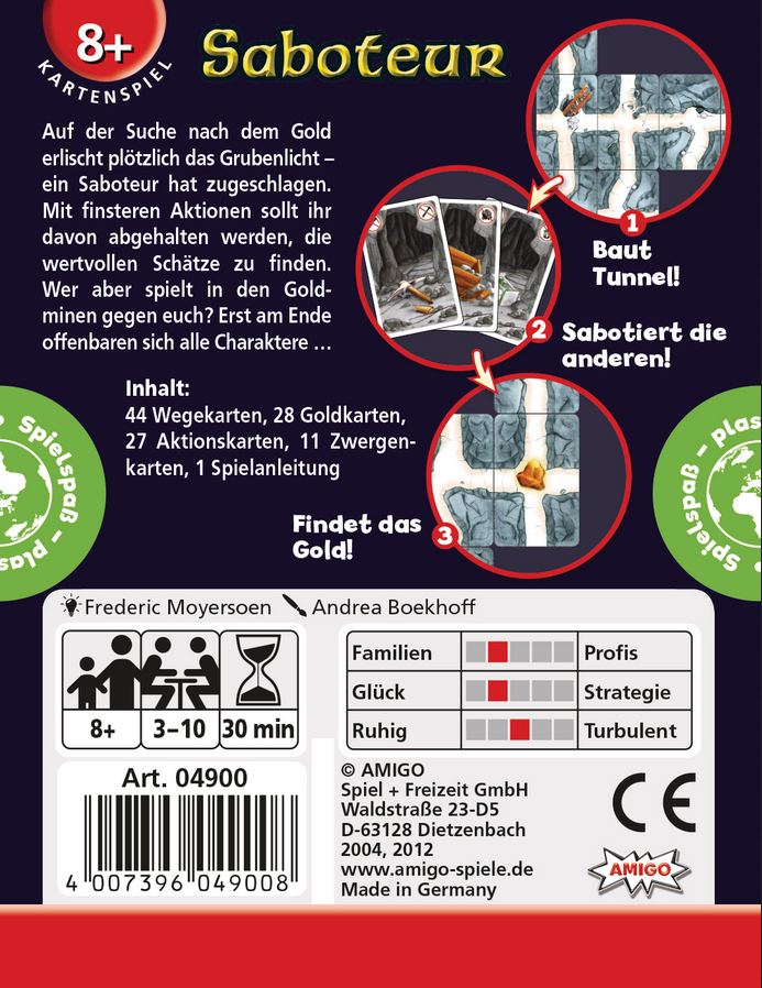 Amigo Saboteur spielt im Dunkel des Bergwerks, endlose Tunnel führen zum Gold, wenn alle Bergarbeiter-Zwerge gut zusammenarbeiten. Oder etwa doch nicht? Es sind Saboteure am Werk und führen die Suchenenden in die Irre! Wer ist es? Oder verraten sich die Saboteure durch ihr Verhalten?