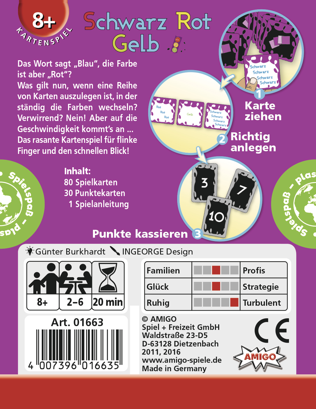 Schwarz Rot Gelb von Amigo - ein schnelles Reaktions-Spiel, bei dem man nicht den Kopf verlieren darf, denn es kann auch schon mal verwirrend werden, mit den Farben, den Wörtern ... also hellwach bleiben, Farb-Wort-Reihen aneinanderlegen und gewinnen!• Schwarz Rot Gelb von Amigo