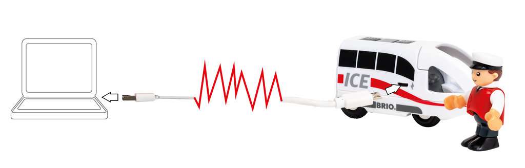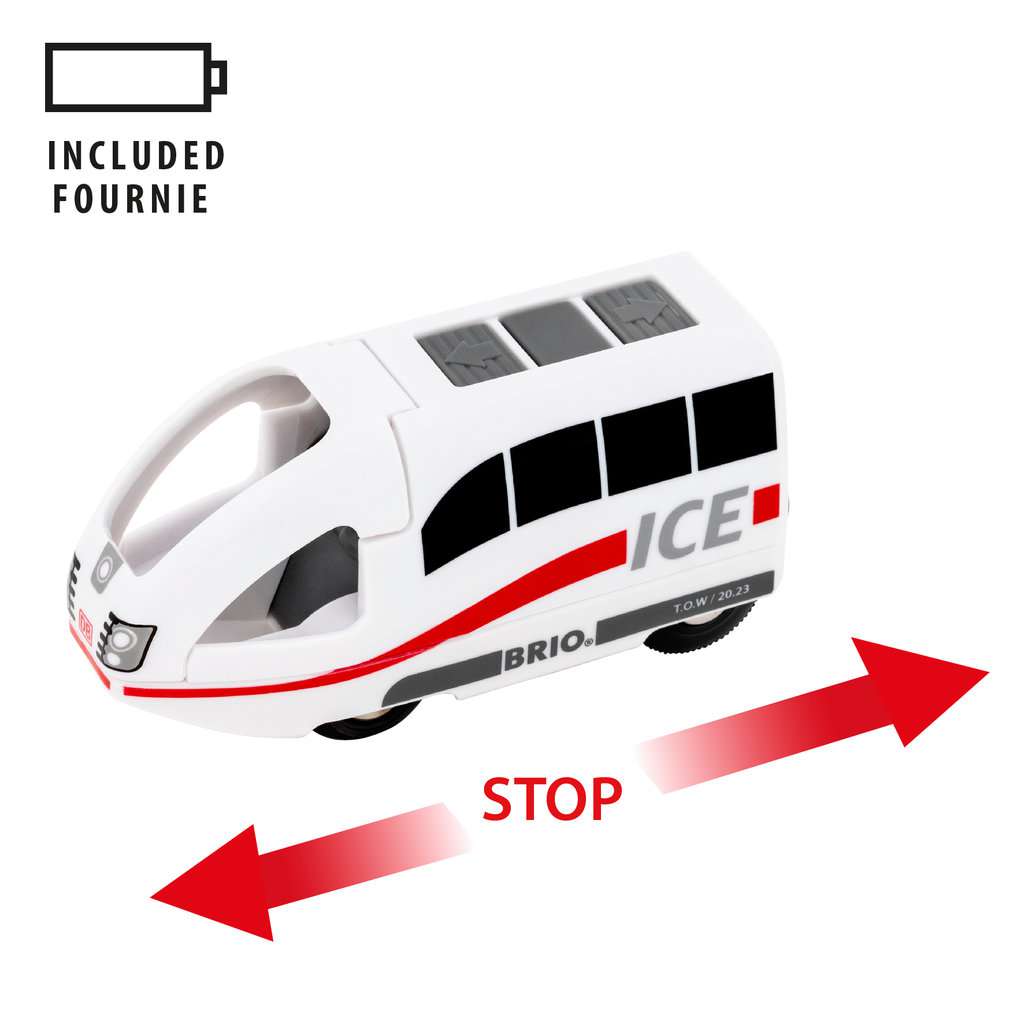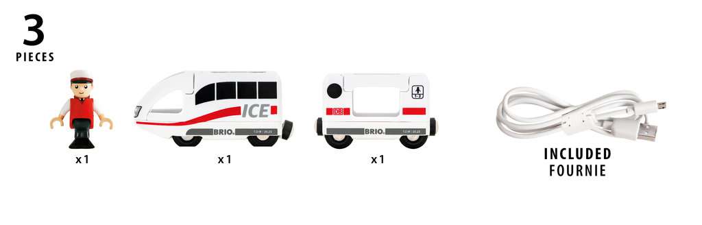 Der ICE Hochgeschwindigkeitszug besteht aus einer Lok mit Platz für einen Lokführer, einem Personenwagen und einem wiederaufladbaren Akku.