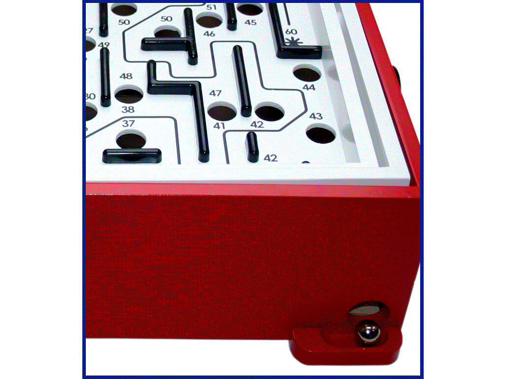 Mit den 2 Rädern an den Seiten wird die Labyrinthplatte gekippt und so die kleine Kugel durch das Labyrinth manipuliert.
