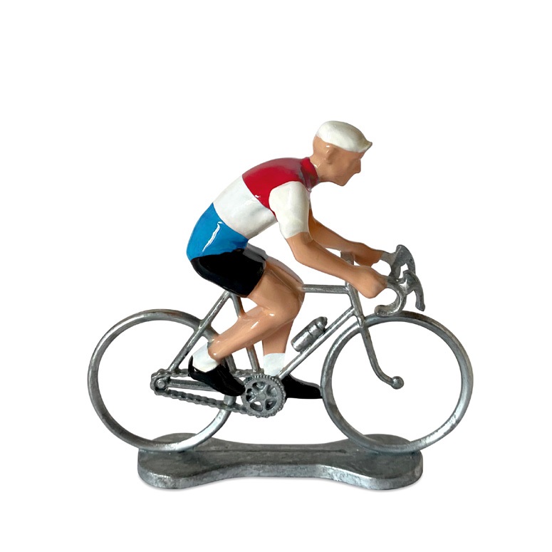 Diese Zinnfigur von Bernard & Eddy stellt einen fahrenden Radrennfahrer im Luxemburg-Trikot dar. Die Figur ist handbemalt.