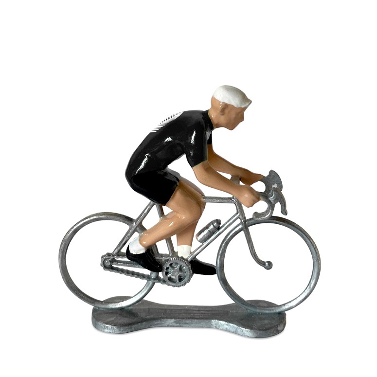 Diese Zinnfigur von Bernard & Eddy stellt einen fahrenden Radrennfahrer im Neuseeland-Trikot dar. Die Figur ist handbemalt.