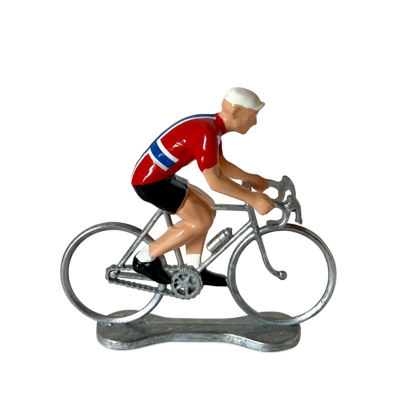 Diese Zinnfigur von Bernard & Eddy stellt einen fahrenden Radrennfahrer im Norwegen-Trikot dar. Die Figur ist handbemalt.