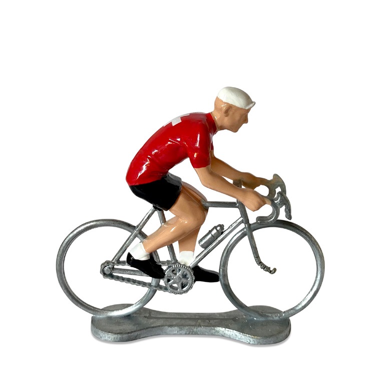 Diese Zinnfigur von Bernard & Eddy stellt einen fahrenden Radrennfahrer im Schweiz-Trikot dar. Die Figur ist handbemalt.