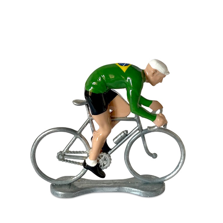Diese Zinnfigur von Bernard & Eddy stellt einen sprintenden Radrennfahrer im Brasilien-Trikot dar. Die Figur ist handbemalt.