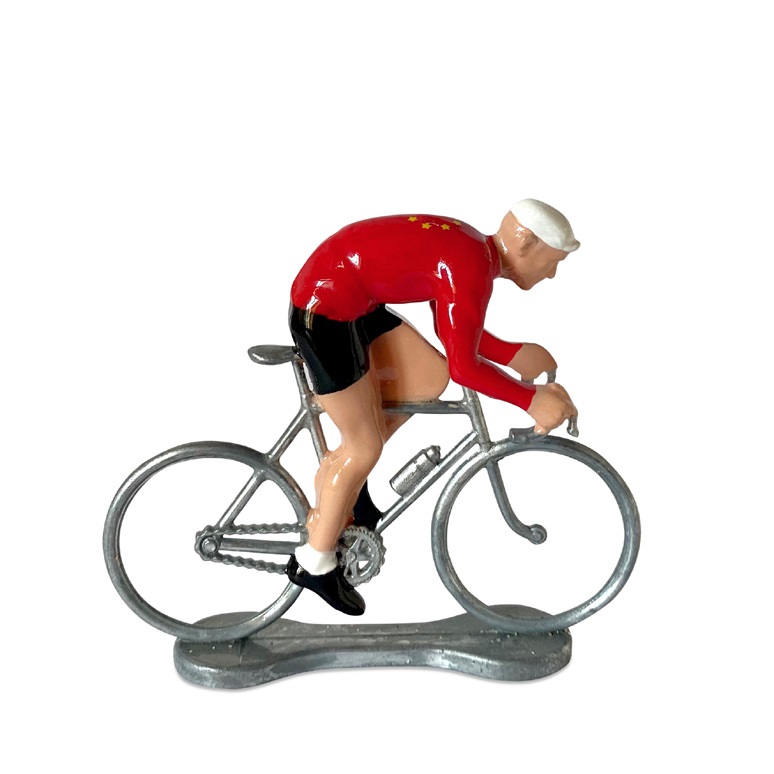 Diese Zinnfigur von Bernard & Eddy stellt einen sprintenden Radrennfahrer im China-Trikot dar. Die Figur ist handbemalt.