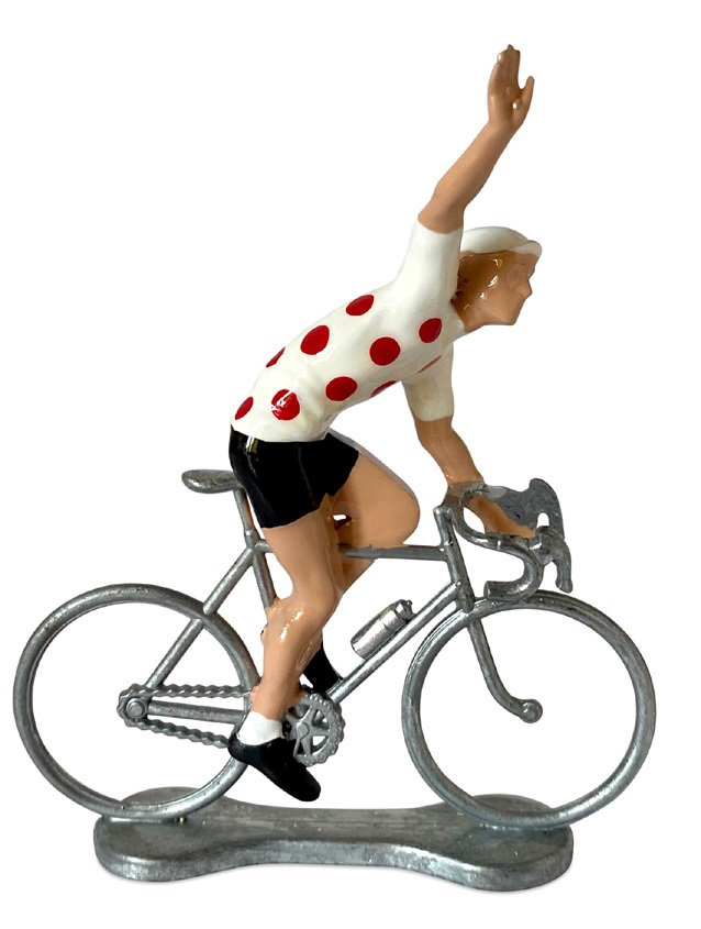 Diese Zinnfigur von Bernard & Eddy stellt einen Radrennfahrer dar, der seinen Arm zum Sieg ausstreckt. Er hat ein rot-gepunktetes Trikot. Die Figur ist handbemalt.
