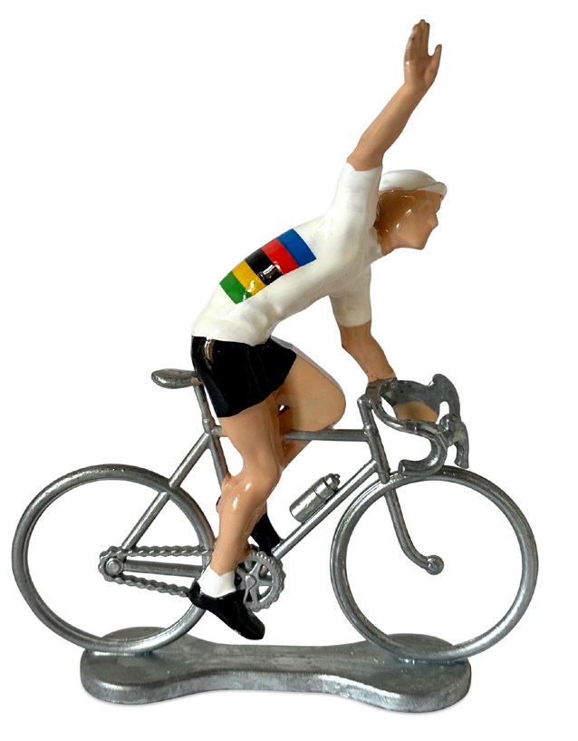 Diese Zinnfigur von Bernard & Eddy stellt einen Radrennfahrer dar, der seinen Arm zum Sieg ausstreckt. Er hat ein Weltmeister-Trikot. Die Figur ist handbemalt.