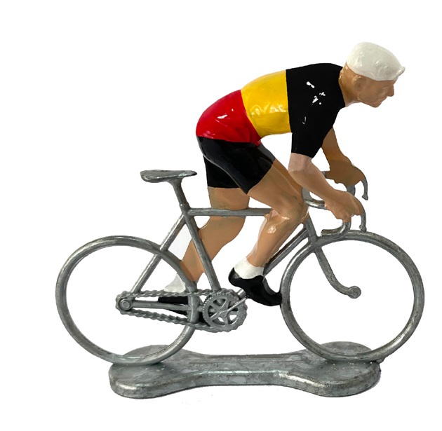 Diese Zinnfigur von Bernard & Eddy stellt einen Radrennfahrer dar, der bergauf fährt. Er hat ein Belgien-Trikot. Die Figur ist handbemalt.