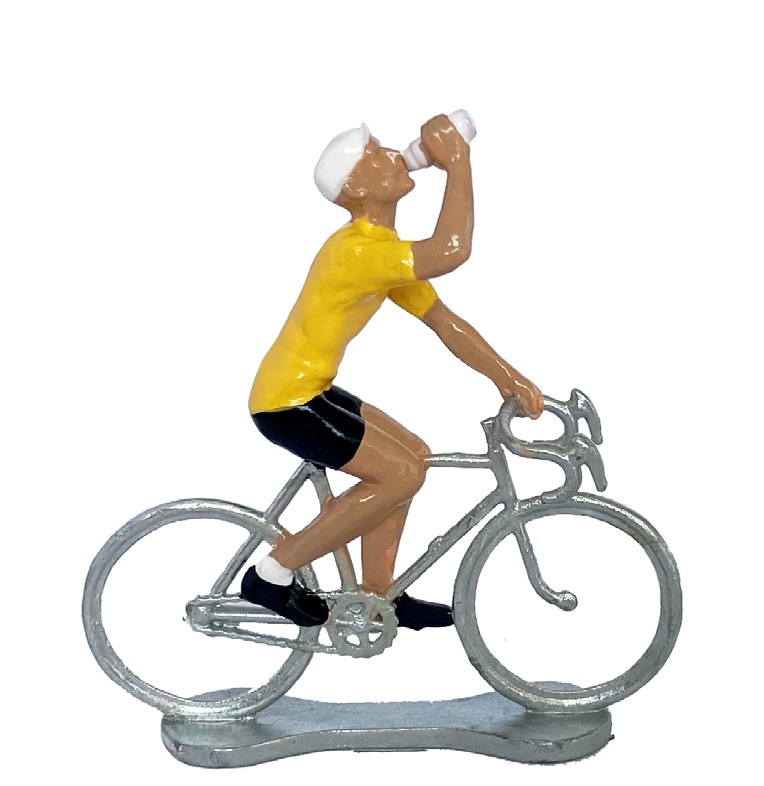 Diese Zinnfigur von Bernard & Eddy stellt einen Radrennfahrer dar, der etwas trinkt. Er trägt ein gelbes Trikot. Die Figur ist handbemalt.