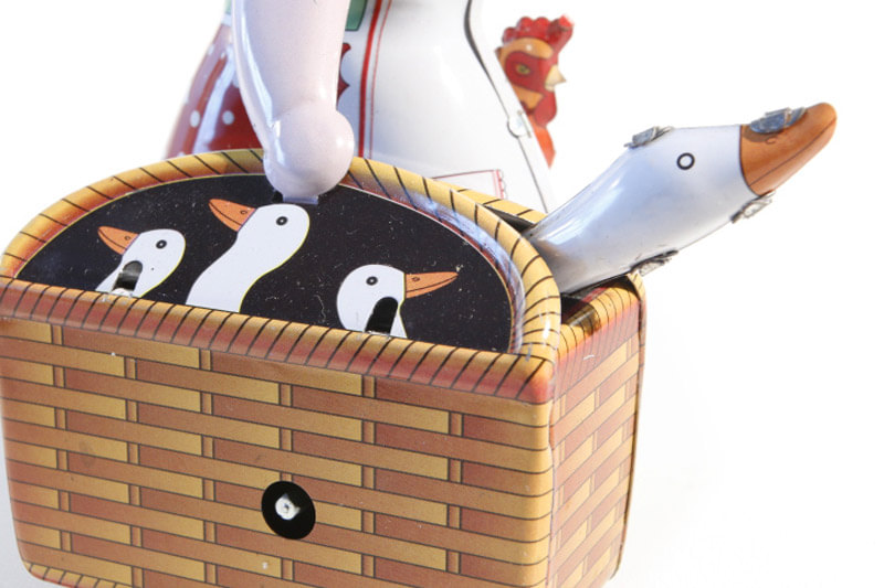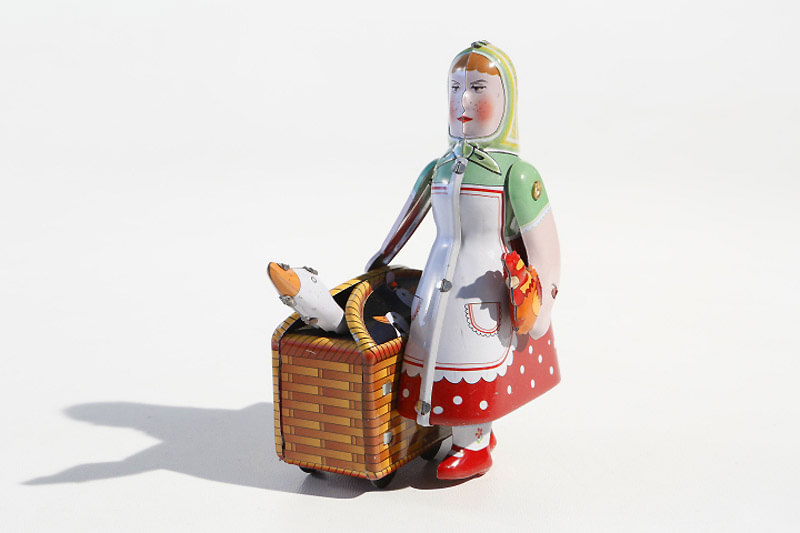 Immer unterwegs mit ihrem Gänsekorb: die Gänseliesel! Ein nostalgisches Blechspielzeug in guter Qualität. Mit dem beiliegenden Schlüssel wird die Feder in dem großen Korb aufgezogen und dann kommt Bewegung in die Figur: Die Bauersfrau läuft fleißig über den Tisch. Dabei gibt es kleine Richtungswechsel und die Beine bewegen sich vor und zurück.