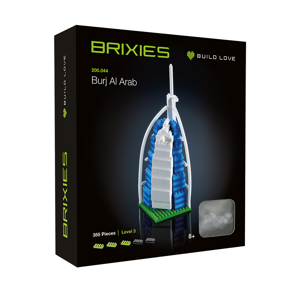 Das Wahrzeichen Dubais als Brixies-Set: Das berühmte Hotel Burj Al Arab steht wie ein Segel im Mittelmeer und verbindet Vergangenheit und Zukunft Dubais. Dieses imposante Gebäude ist ein Sinnbild für Geschäftstüchtigkeit und somit möglicherweise das richtige für dein Büro!