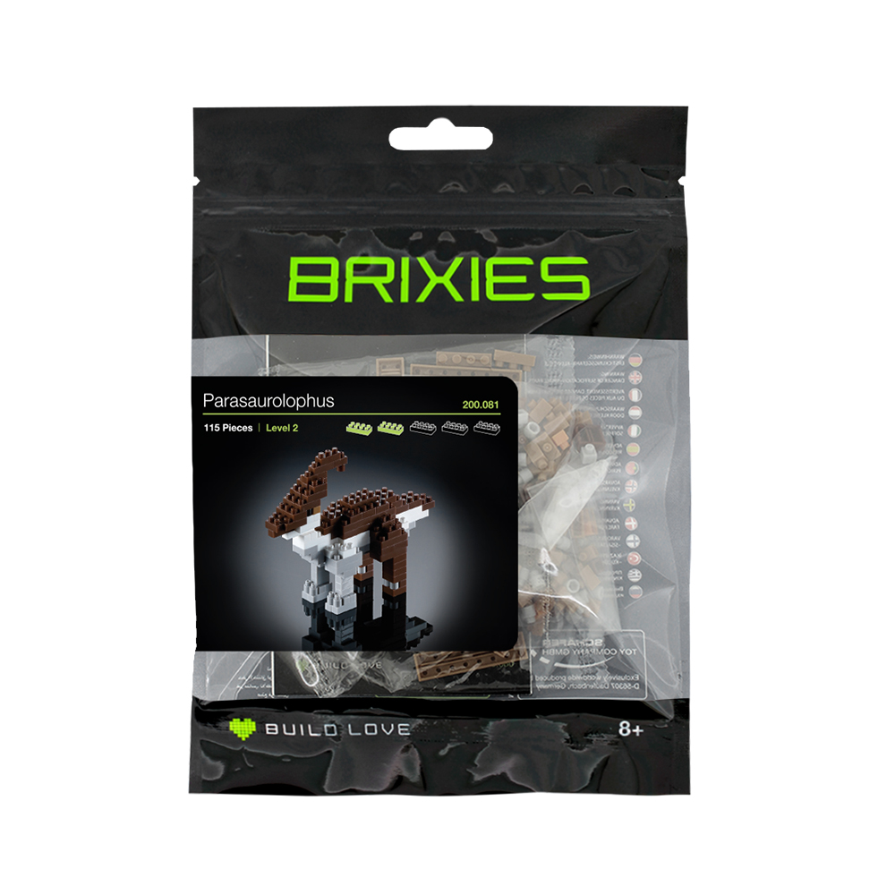 Der Parasaurolophus von Brixies hat natürlich den langen Knochenbogen hinten am Kopf - genau wie sein Vorbild aus der Urzeit. Ein prima Set für Dino-Fans, zum Selbstbauen oder zum Verschenken.