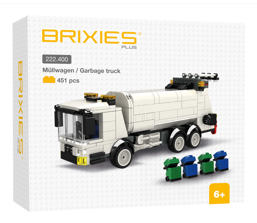 Der BRIXIES Plus Müllwagen Garbage Truck ist ein tolles Bau- und Spiel-Set aus der Welt der Stadtreinigung. Der Müllwagen hat einen zu öffnenden Laderaum und 4 klappbaren Mülltonen. Klemmbaustein-Sets födern die Feinmotorik, Konzentration und Geduld. Das Spielen mit dem Müllwagen regt die Fantasie an. Die Steine können selbstverständlich auch frei zu eigenen Kreationen zusammengesteckt und mit den Steinen anderer Sets kombiniert werden.