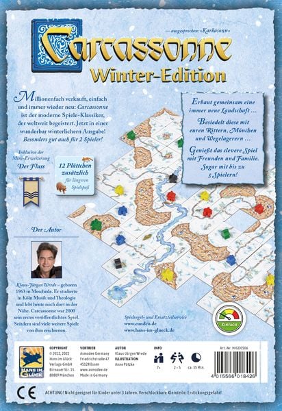 In der Carcassonne Winter-Edition vom Hans im Glueck Verlag ist die ganze Stadt in winterliches Schneeweiß getaucht: Ritter, Gefolgesleute, Bauern, Wegelagerer gehen ihrem winterlichen Tagwerk nach. Als Zugabe gibt es 12 zusätzliche Plättchen und die Mini-Erweiterung "DerFluss".