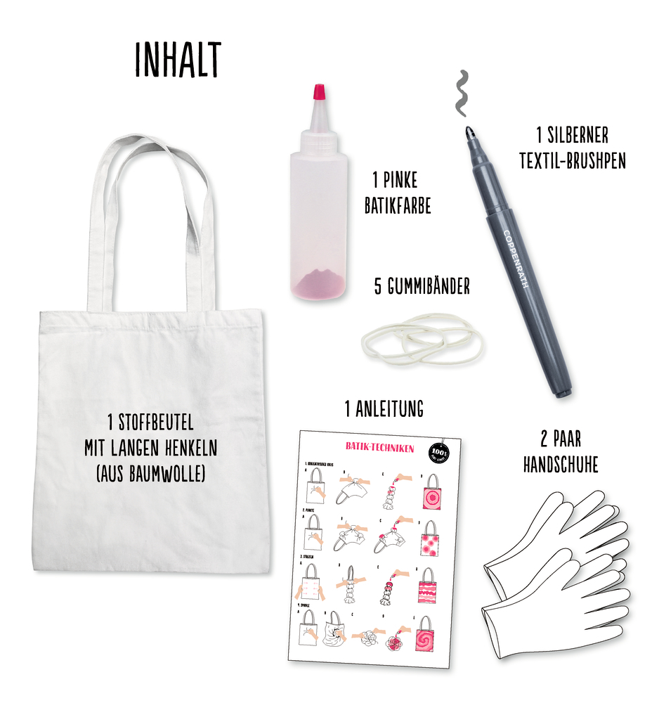 • Inhalt: 1 Tasche, 1x pinke Batik-Farbe, 5 Gummibänder, 2 Paar Handschuhen, 1 Textil-Brushpen und Anleitung