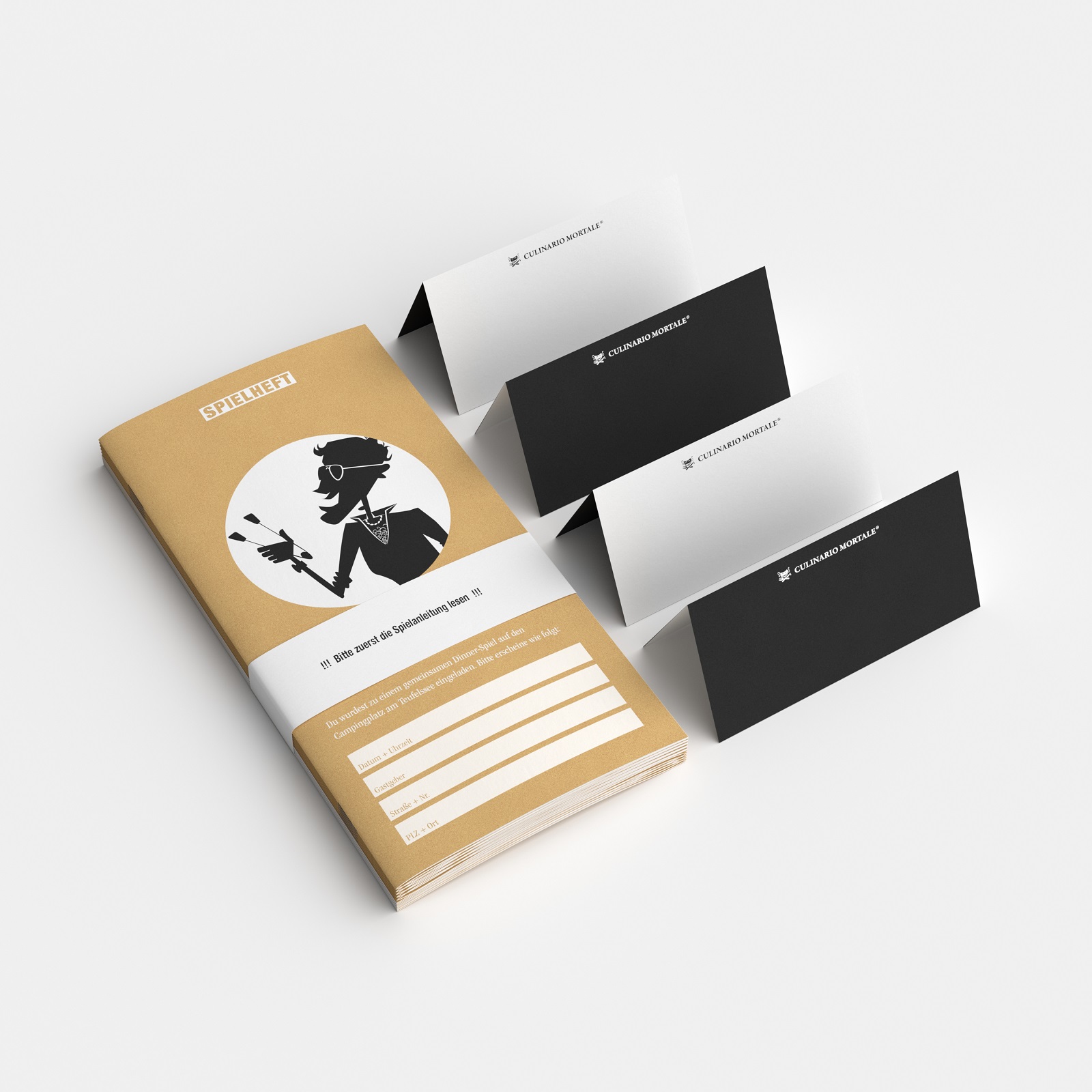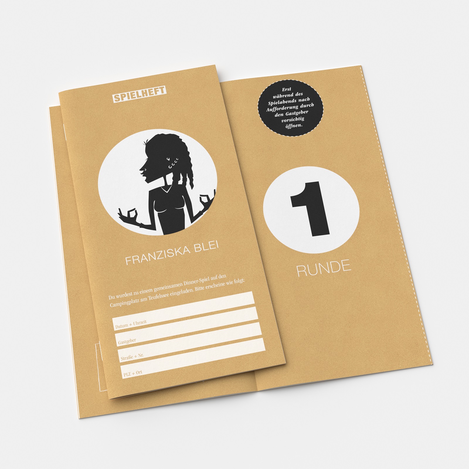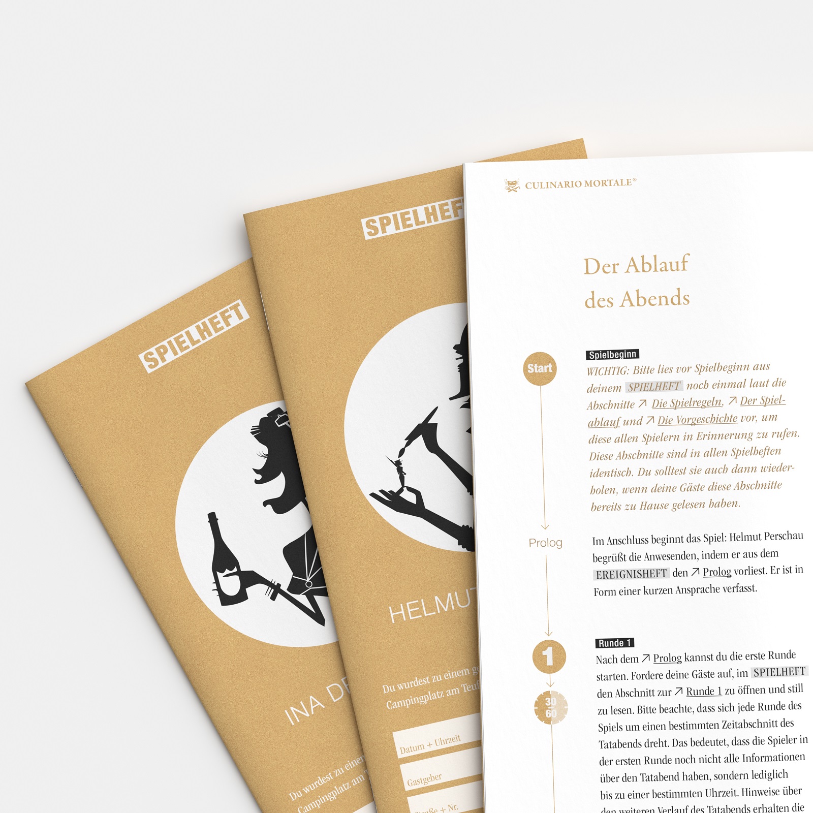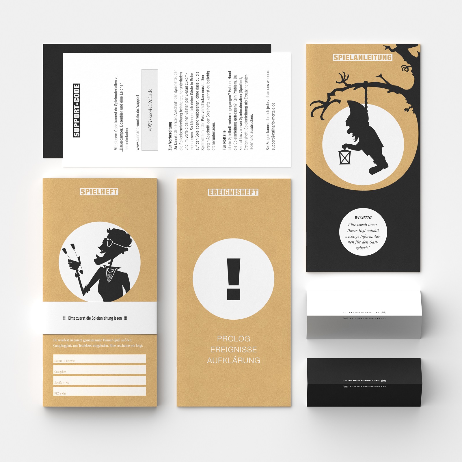 • Inhalt: 1 Spielanleitung, 8 Spielhefte, 1 Ereignisheft (beinhaltet Prolog, Ereignisse und Auflösung), 8 Namensschilder, 1 Support-Code