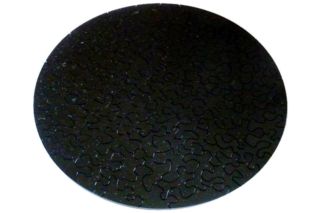 Ausführung: Plexiglaspuzzle, 88 Teile, 20cm Durchmesser, Vorder- und Rückseite schwarz, runde Verpackung mit 2 Leichtmetalldeckeln.