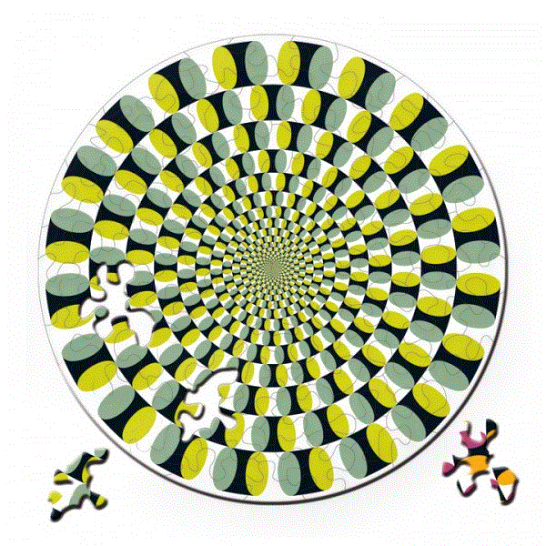 Fast schon psychedelisch wirkt dieses verrückte Puzzlemuster in Kreisform. Das Double Puzzle Swing hat wenigstens zwei unterschiedliche Farbgebungen auf der Vorder- und Rückseite. Das hilft schon weiter, wenn man nicht an den wilden Formen der einzelnen Holzteile verzweifelt. Nur Mut, das Ergebnis wird toll!