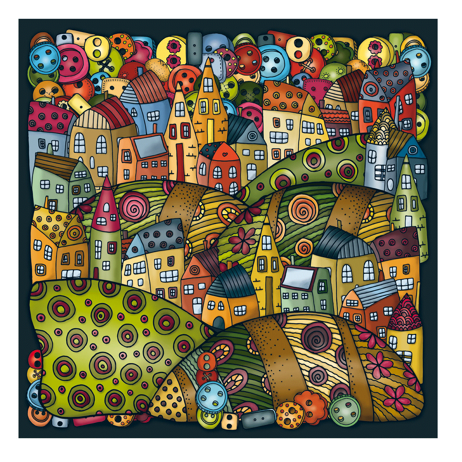 Die 210 Teile des bunten Bergdorf-Puzzles werden direkt in den schwarzen Puzzlerahmen gesetzt. Dieser hat auf der Rückseite einen Aufsteller und Aufhänge-Ösen. So kann das fertige Puzzle-Werk gleich die Wohnung zieren.
