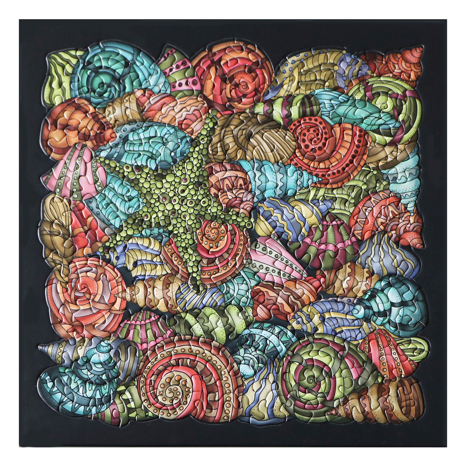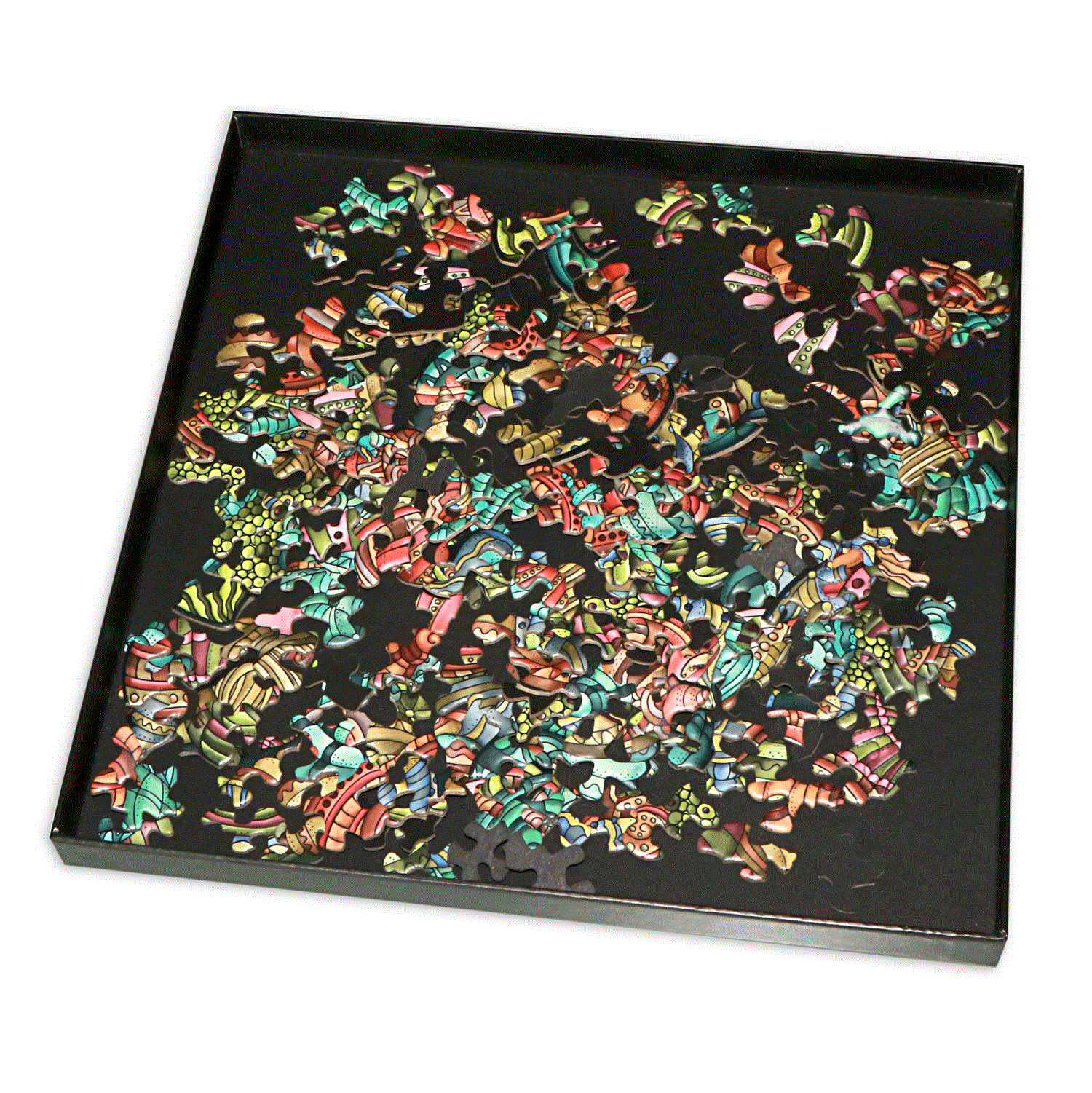 Die 208 Teile des bunten Muschel-Puzzles werden direkt in den schwarzen Puzzle-Rahmen gesetzt. Dieser hat auf der Rückseite einen Aufsteller und Aufhänge-Ösen. So kann das fertige Puzzle-Werk gleich die Wohnung zieren.