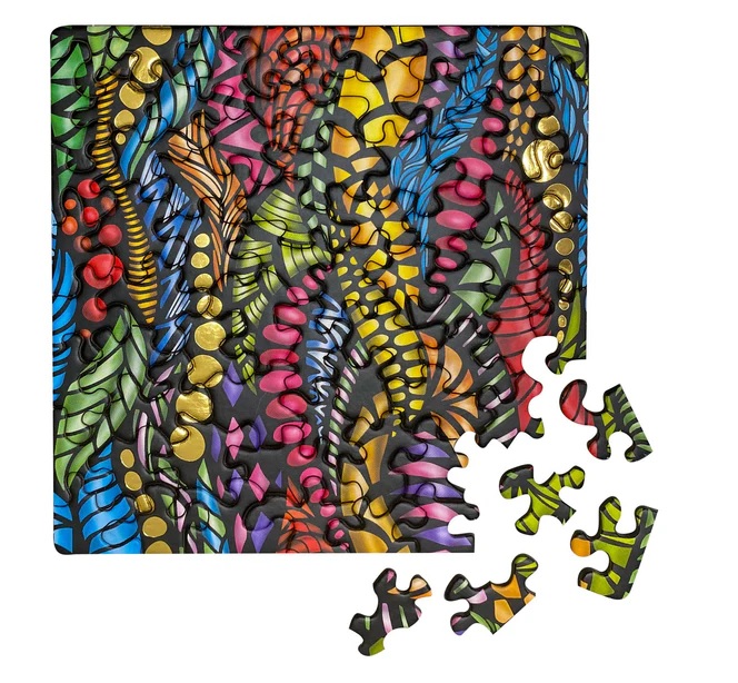 Q-Puzzle mit bunten Schlangenartigen Motiv. Die Reihe Gold hat besondere Metallic-Druck-Effekte. Die kleinen quadratischen Puzzles eignen sich perfekt als schönes Geschenk, eine Kleinigkeit zwischendurch für alle die Legespiele mögen!