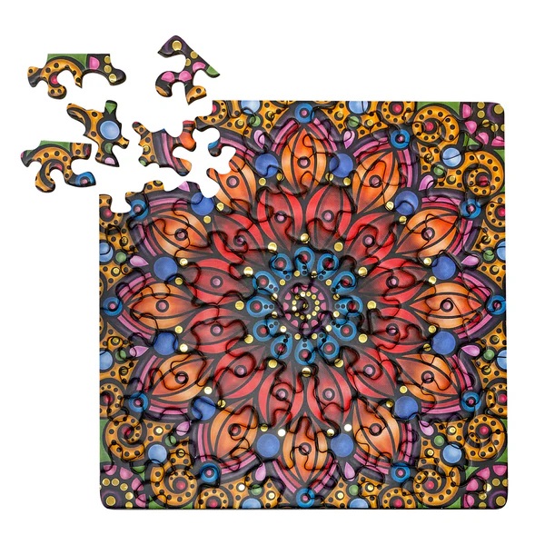 Q-Puzzle mit buntem mandala-artigem Motiv. Die Reihe Gold hat besondere Metallic-Druck-Effekte. Die kleinen quadratischen Puzzles eignen sich perfekt als schönes Geschenk, eine Kleinigkeit zwischendurch für alle die Legespiele mögen!