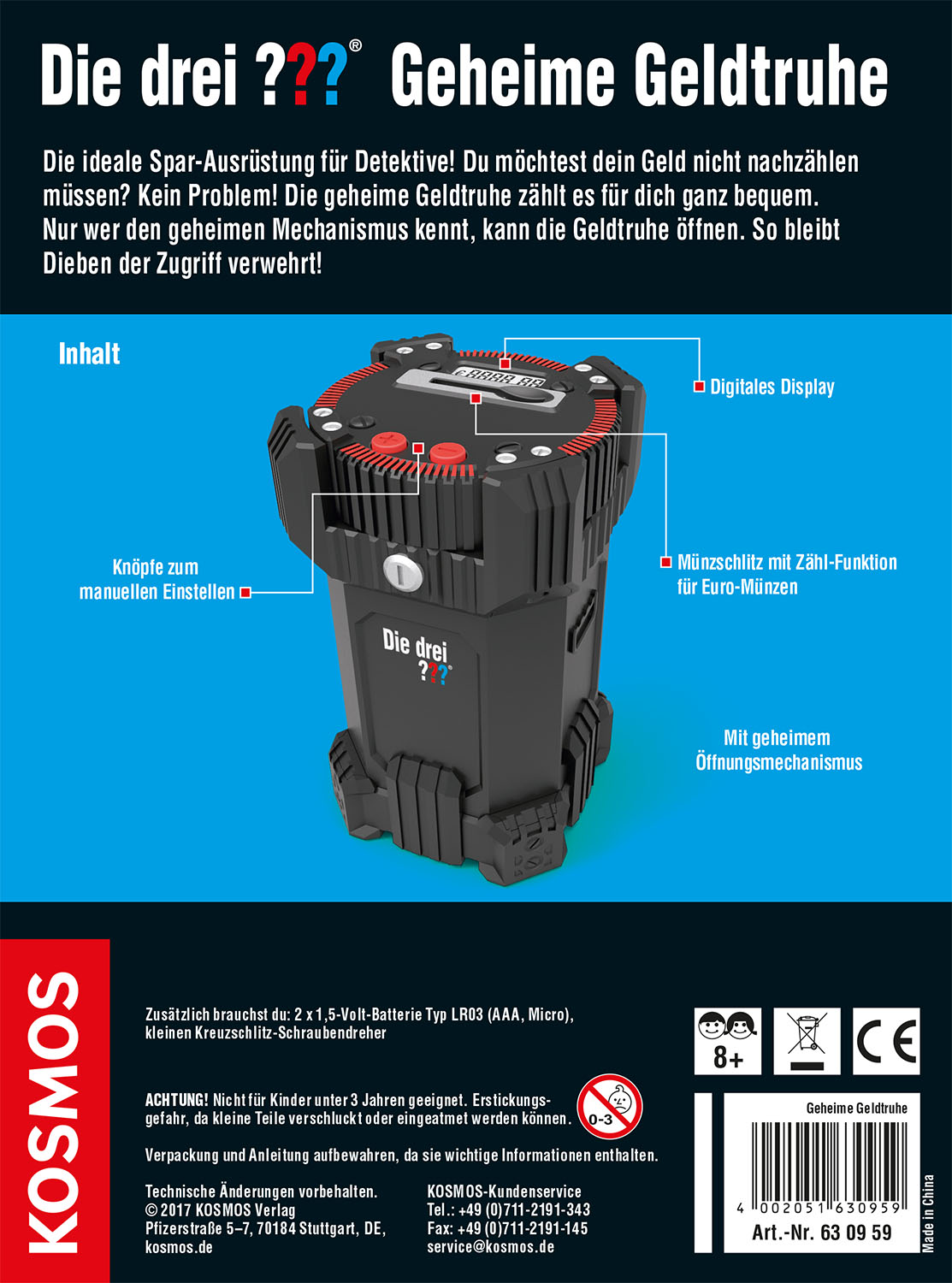 Die Kosmos Verlag Spardose Drei ??? Geheime Geldtruhe ist ein spannendes Accessoire zur Aufbewahrung großer Schätze. Vor allem Fans der Drei ??? Kommen voll auf ihre Kosten aber auch alle anderen Technik-Begeisterten Kinder werden staunen. Denn hinter dem futuristischen Design der Sparbüchse steckt tatsächlich aufregende Technik. Der eingebaute Münzzähler gibt unseren Kids jederzeit einen Überblick zu ihrem eingezahlten Geld. So lässt es sich prima für die nächste größere Anschaffung sparen und all das Geld ist in diesem Mini-Tresor sicher verwahrt. Und Justus, Peter und Bob sind in Gedanken immer dabei.