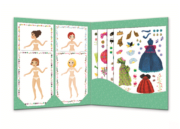 Die klassische Anziehpuppe in moderner Form: Mit Stickern werden hier Damen angezogen, très chic, très chic!
