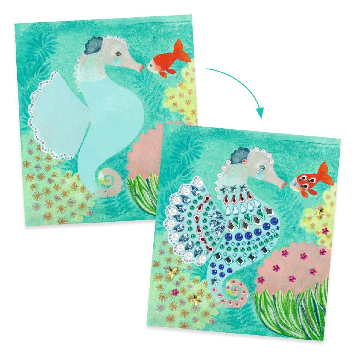 Bei den Djeco Artistic Strass - Bastelsets - hier mit dem Titel Wasserwellen - werden tolle illustrierte Karten Stück für Stück mit selbstklebenden Glitzersteinen versehen. So entstehen wahrlich funkelnde Kunstwerke. Die Steinchen haben verschiedene Farben und Formen und werden zum Beispiel dem Fisch als bunt schillernde Schuppen geklebt.
