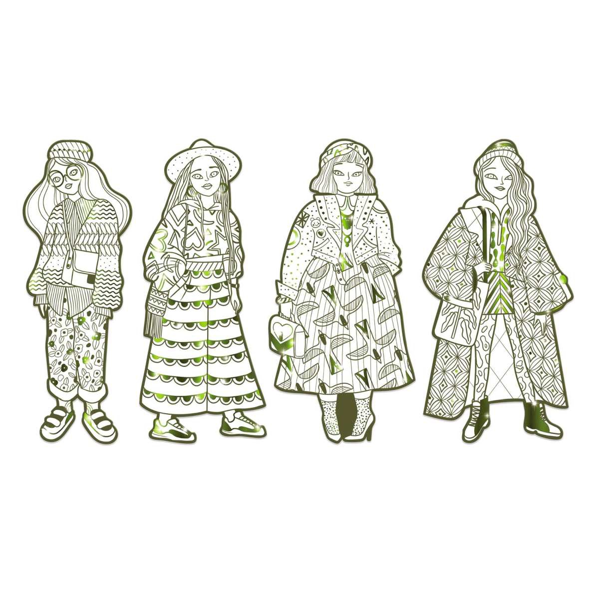 Catwalk! Die heißen Outfits des Desmoiselles von Djeco werden von dir selbst ausgemalt und gestaltet. Vier 32 cm große Silhouetten aus festem Kartonpapier sind im Paket enthalten, dabei sind die Konturen und einige Metallicflächen schon vorgegeben.