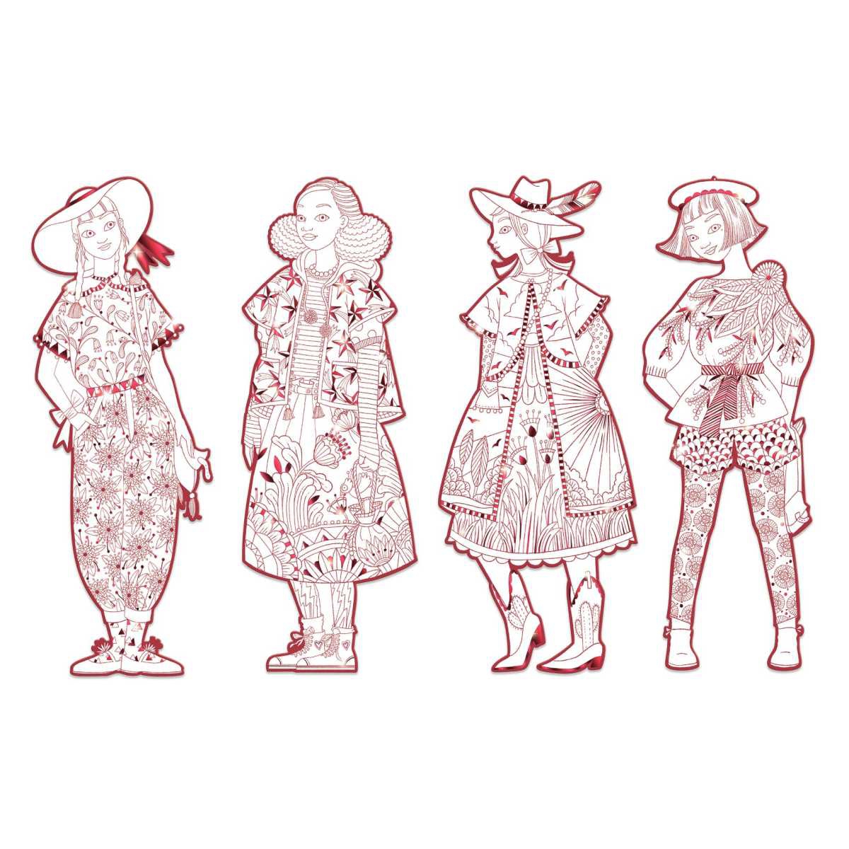 Catwalk! Die heißen Outfits des Desmoiselles von Djeco werden von dir selbst ausgemalt und gestaltet. Vier 32 cm große Silhouetten aus festem Kartonpapier sind im Paket enthalten, dabei sind die Konturen und einige Metallicflächen schon vorgegeben.