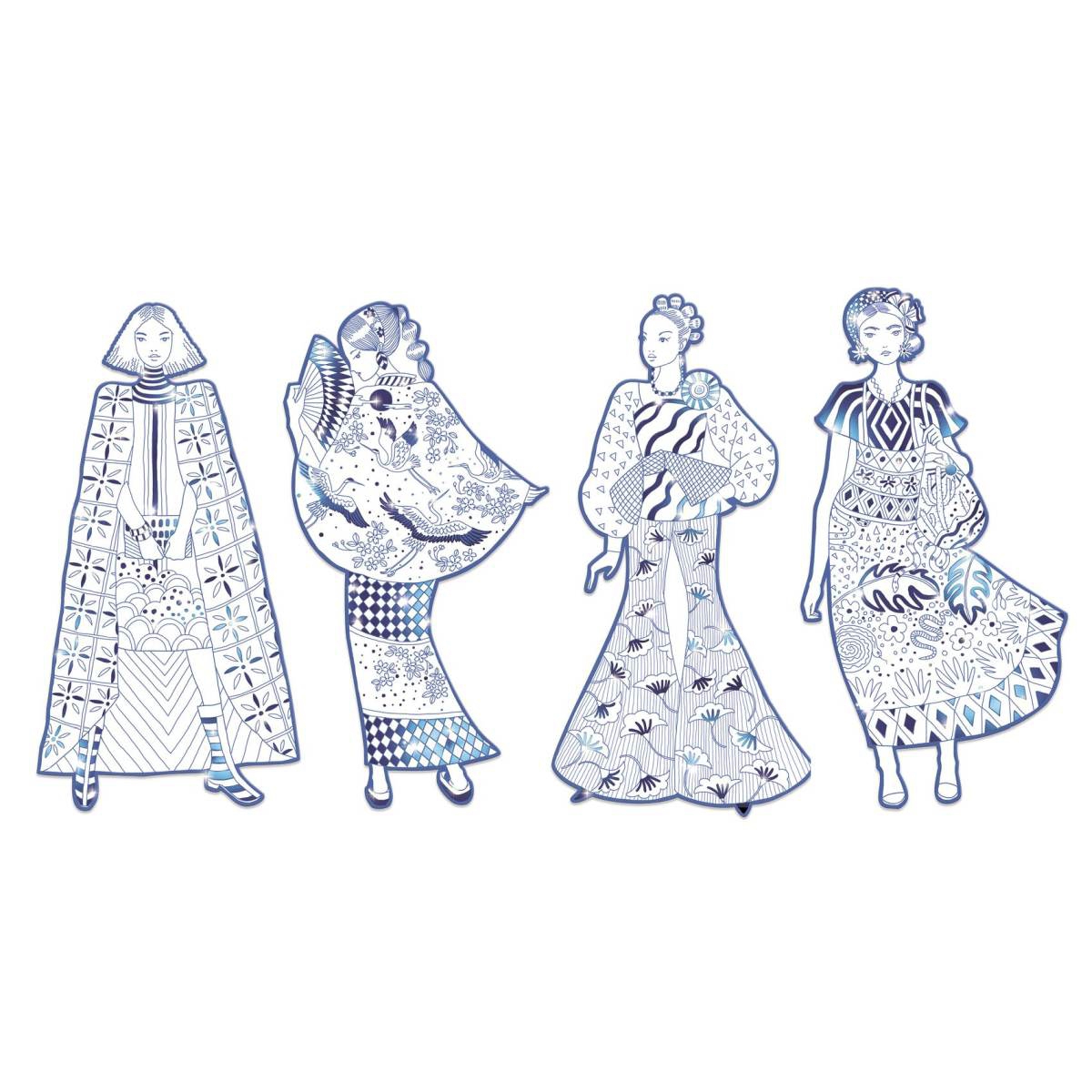 Catwalk! Die heißen Outfits des Desmoiselles von Djeco werden von dir selbst ausgemalt und gestaltet. Vier 32 cm große Silhouetten aus festem Kartonpapier sind im Paket enthalten, dabei sind die Konturen und einige Metallicflächen schon vorgegeben.