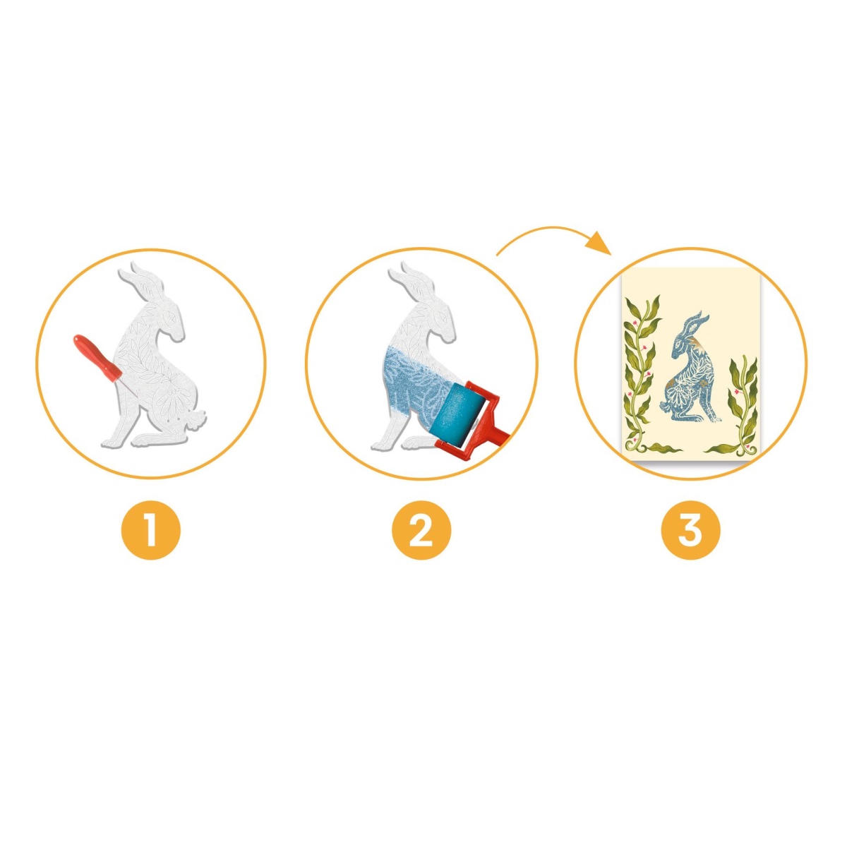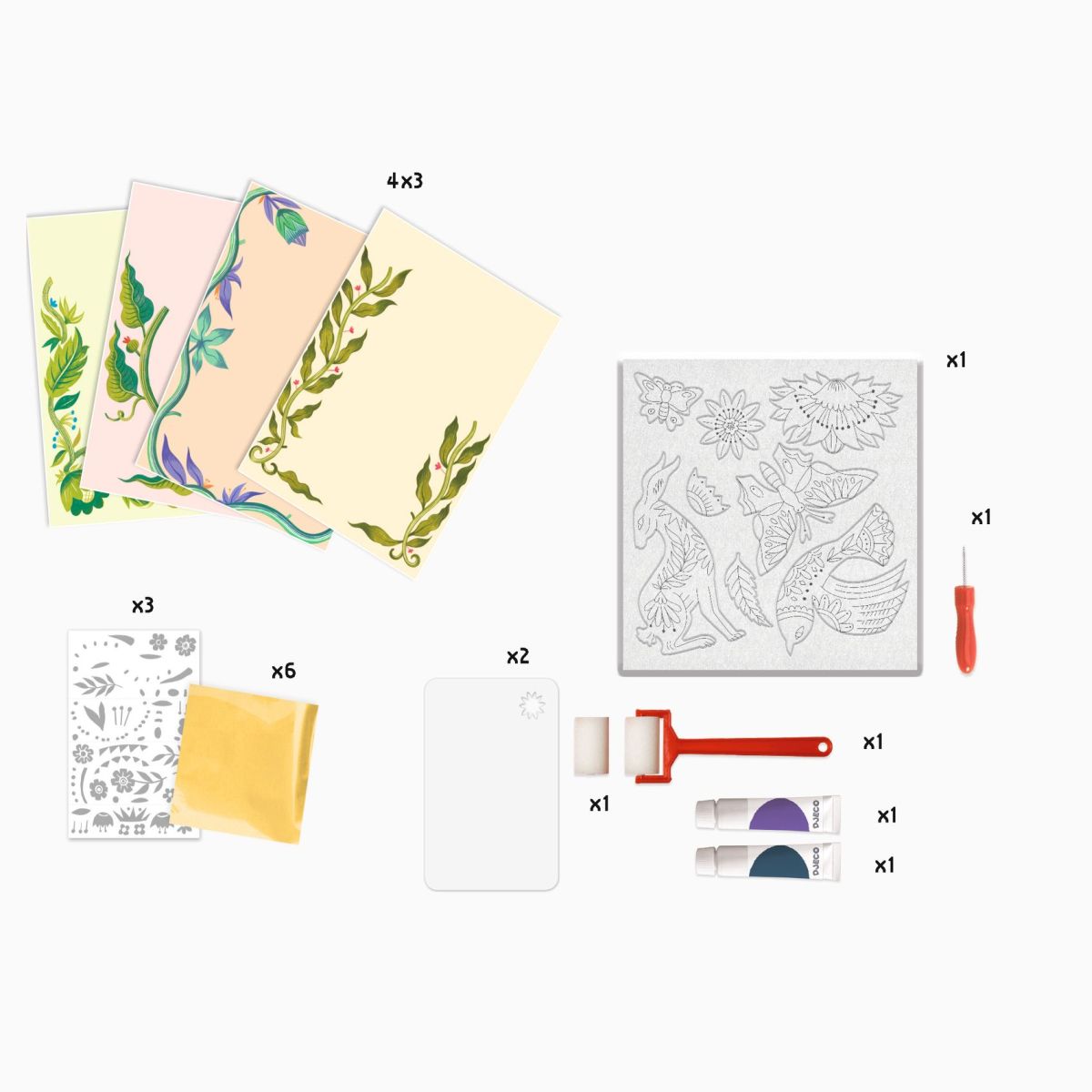 • Inhalt: 12 Karten, 8 Gravurstempel, 1 Stichel, 2 Farbtuben, 2 Schaumstoff-Farbrollen, 2 Paletten, 3 Bögen Papier mit Metallic-Effekt, 3 Bögen mit Motiven zum Metallisieren