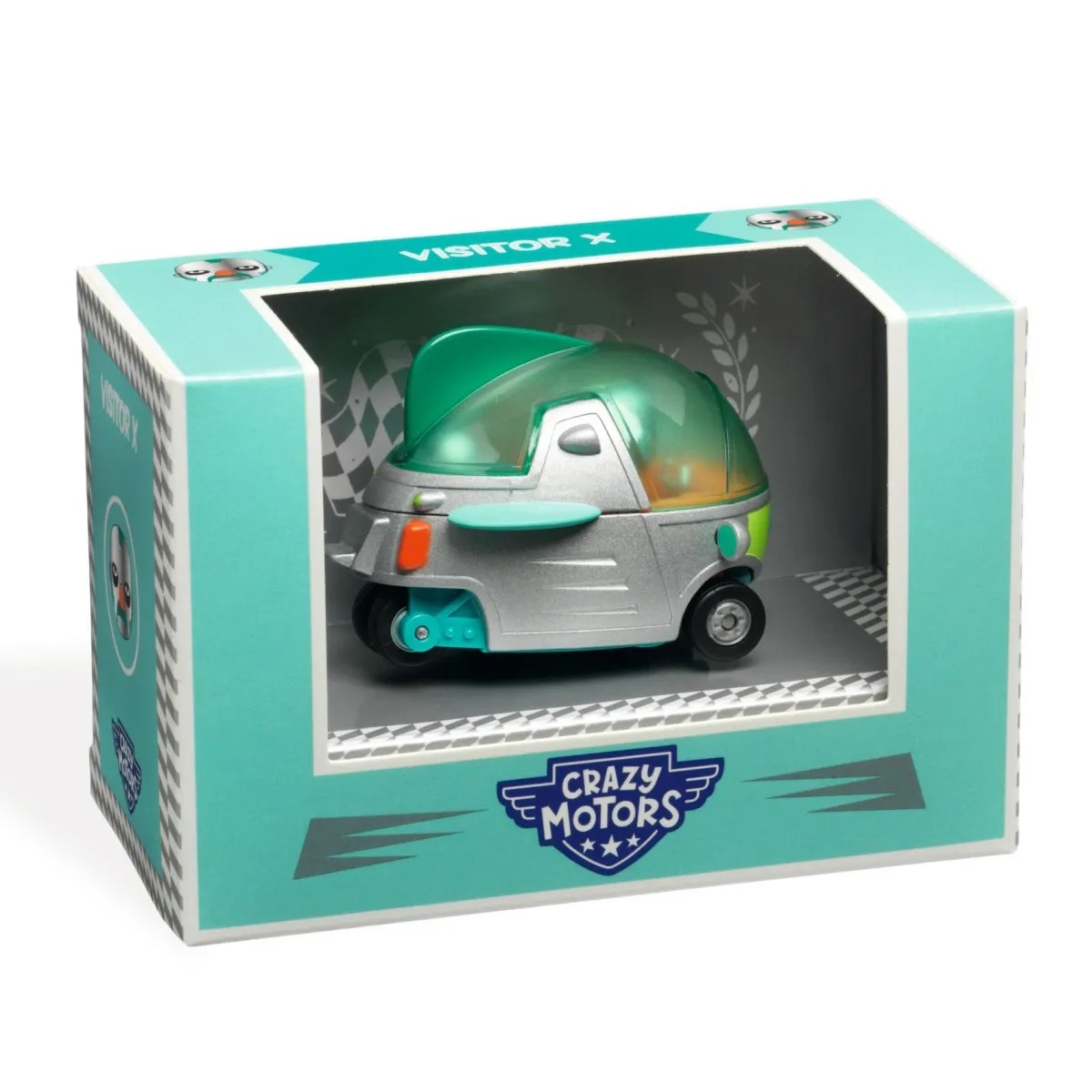 Dieser witzige Weltraum Flitzer mit Namen Visitor X ist Teil der Spielzeugauto-Serie Crazy Motors von Djeco.