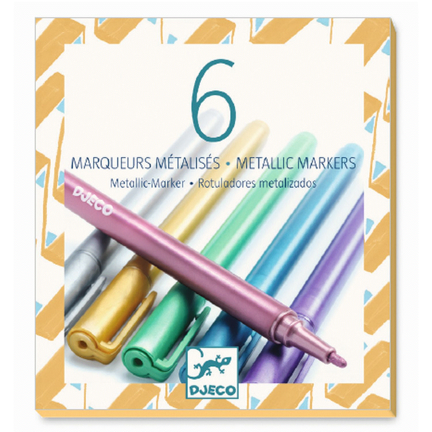 Für Kreative Designer*Innen: 6 hochwertige Metallic Marker von Djeco. Die metallisch glänzenden Farben wirken auf deinen Kunstwerken besonders cool und elegant!