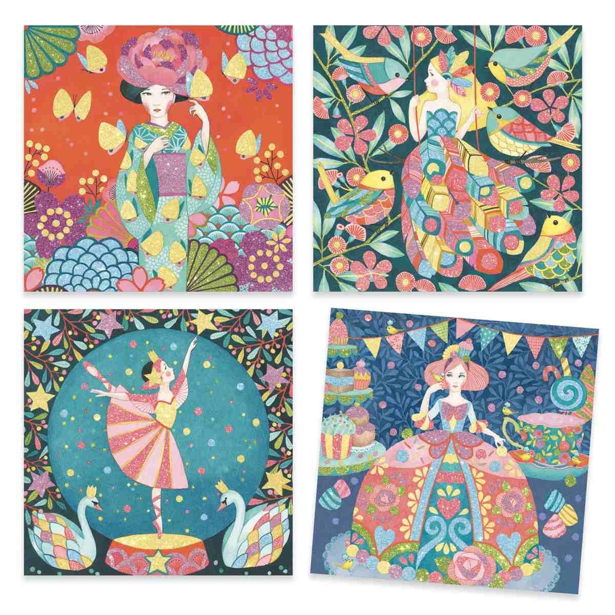 • Inhalt: 4 bedruckte Karten (20 x 20 cm) mit vorbereiteten Klebeflächen, 6 Tuben Glitter (Gelb, Blau, Parma, fluoreszierendes Rosa, Grün, Fuchsia), 1 Werkzeug aus Kunststoff, 1 Pinsel und 1 Schritt-für-Schritt-Anleitung in Farbe.