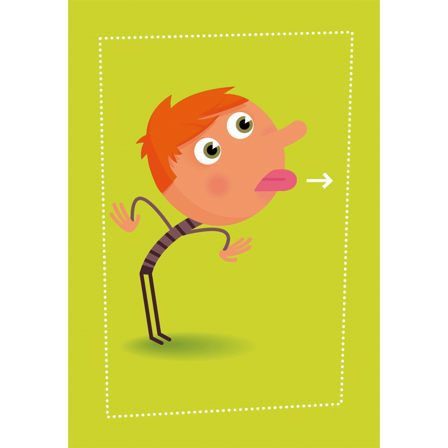 Im Stile von "Ich packe meinen Koffer mit..." werden reihrum Karten mit Aktionen aufgedeckt: Zunge rausstrecken, Hände klatschen, auf den Boden stampfen,... Alle Aktionen müssen vom nächsten Spieler immer in der gleichen Reihenfolge wiederholt werden und jedesmal kommt eine dazu. Viel Spaß!