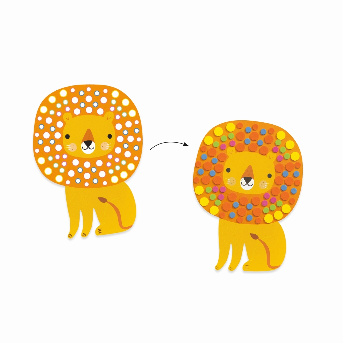 • Inhalt: 3 illustrierte Tier-Motive und 8 Bögen mit Schaumstoff-Klebepunkten