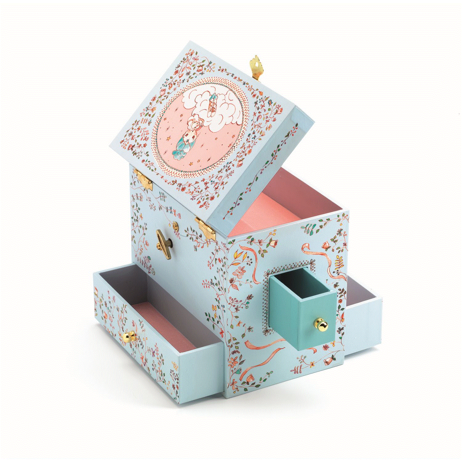 Diese Spieldose hat viele kleine Schubladen, damit Ringe und Schätze gut sortiert werden können. Das Hauptfach mit der Tänzerin hat auch einen kleinen Spiegel.
