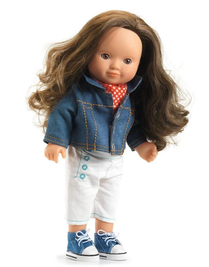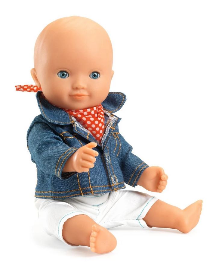 Das Djeco POMEA Puppen Jeans-Jacke mit coolem Halstuch steht allen Puppen gut! Mädchen, Jungs, Kleinkinder, geht alles. Echt lässig!