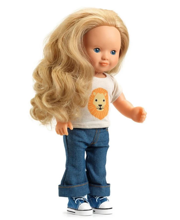 Das Djeco POMEA Puppen-Outfit Lovely Ivory passt Mädchen und Jungen-Puppen: Eine coole Jeans mit Schlag und ein T-Shirt mit Löwenaufdruck. Echt lässig!