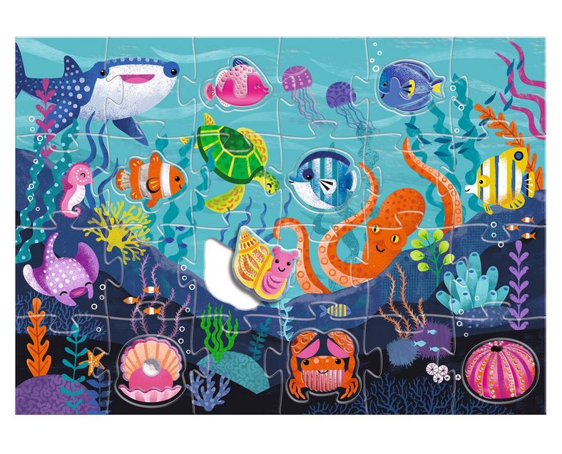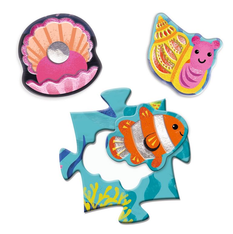 Das Djeco Puzzle Tactilo Meer hat schön große Teile für Kinderhände und als Spezial-Aufgabe 4 Teil-in-Teil-Teile: In ein "normales" Teil wird z.b. die Muschel nochmal extra eingesetzt. Und zum Ertasten haben die Teile verschiedene Oberflächen (Texturen). Das ist doppelt-clever!