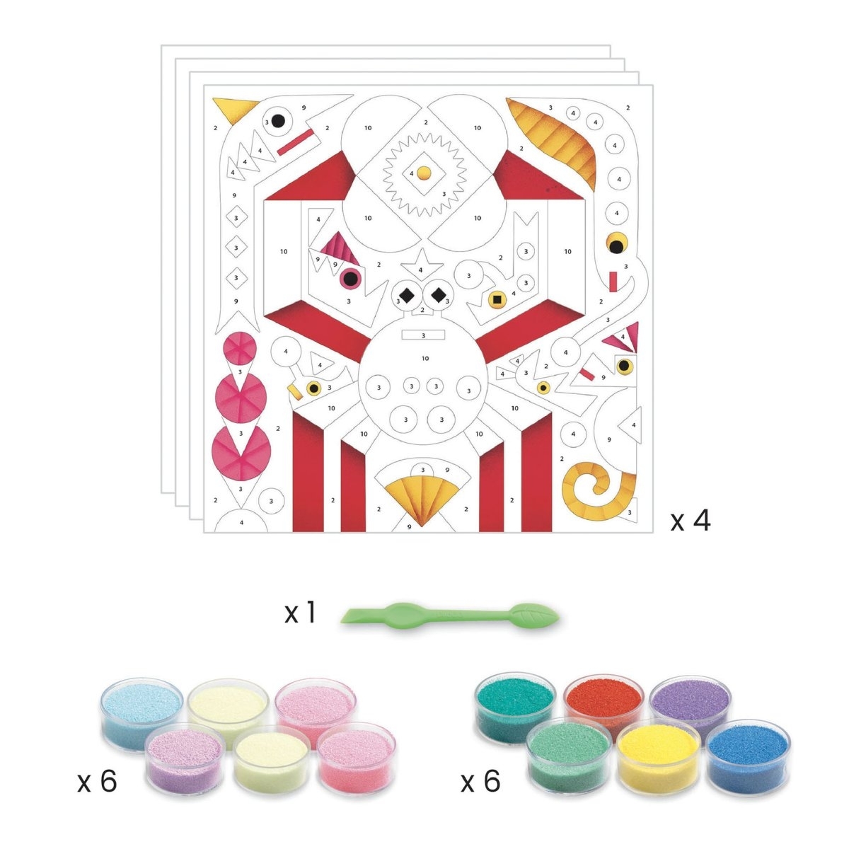 • Inhalt: 4 teilweise illustrierte Karten (20 x 20 cm) mit vorbereiteten Klebeflächen, 12 Töpfe mit farbigem Sand, davon 6 phosphoreszierende Farbtöne, 1 Werkzeug aus Kunststoff, 1 Schritt-für-Schritt-Anleitung in Farbe