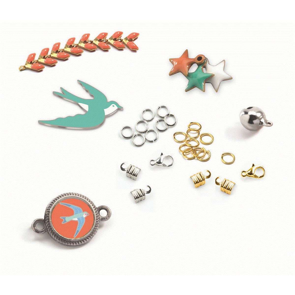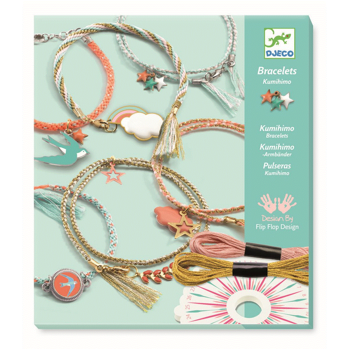 Das Schmuckset „Rund um den Himmel“ von Djeco ist ein besonderes Bastelset, aus dem wunderschöne Kumihimo-Armbänder selbst hergestellt werden können. Das Flechten und Basteln macht unheimlich viel Spaß und das spätere Tragen der Armbänder macht die kleinen Künstler extra stolz. Mit der hübsch verzierten Flechtscheibe können verschiedene Muster und Farbkombinationen hergestellt werden. Illustrierte Anhänger runden dann die eigenen Kreationen ab. Die Farbauswahl ist harmonisch aufeinander abgepasst und regt die Phantasie an. Eine Beschäftigung, die die Feinmotorik, die Kreativität, das handarbeitliche Geschick sowie die Konzentration fördert.