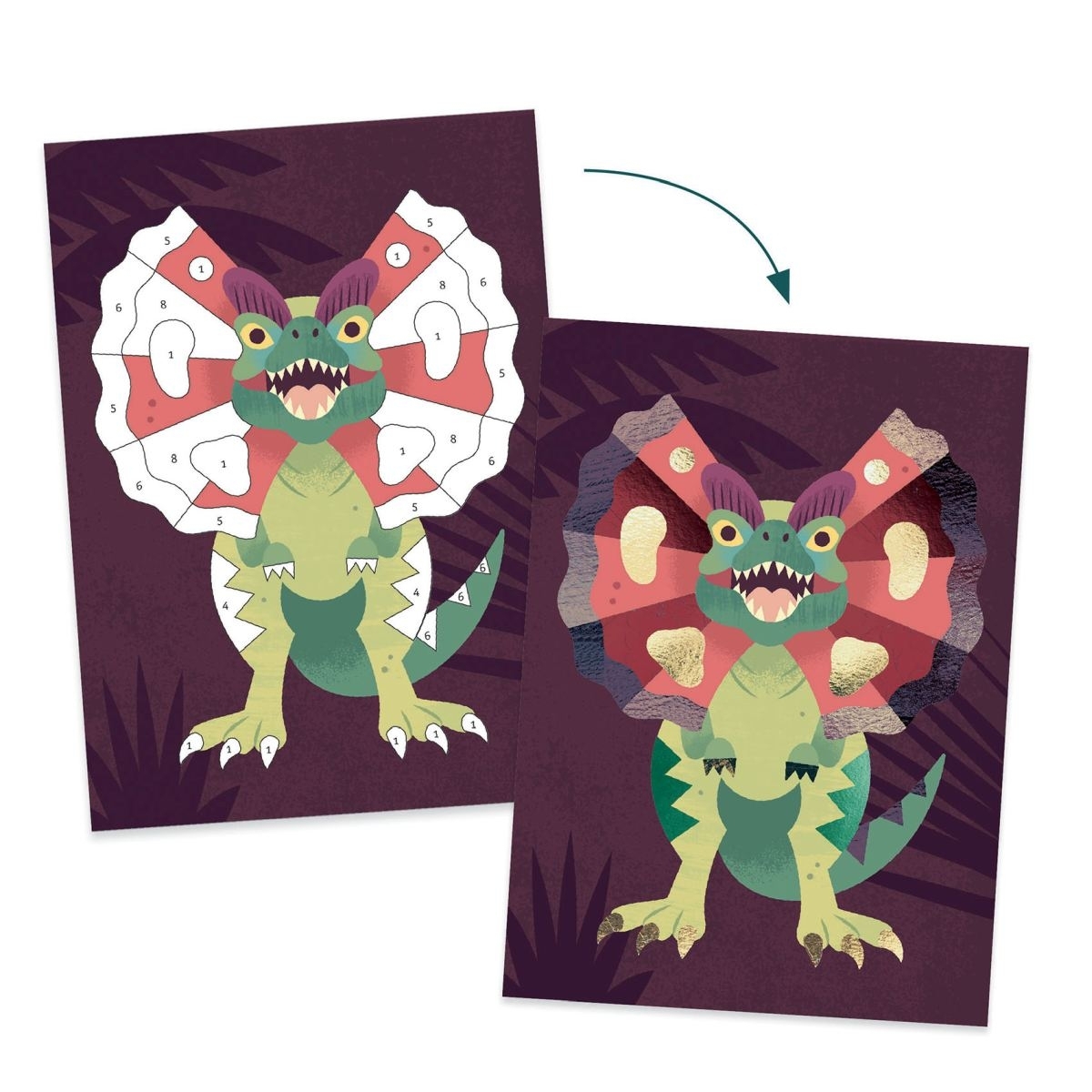 Beim Djeco Set Metallfolie: Jurassic werden 4 schöne Dinosaurier-Bilde mit Glitzerfolie beklebt. Zahlen-Markierungen zeigen an, wo die Folie hinkommt. Ein spannendes Spezial-Werkzeug hilft beim Basteln. Toll für alle Bastel- und Dino-Freunde!